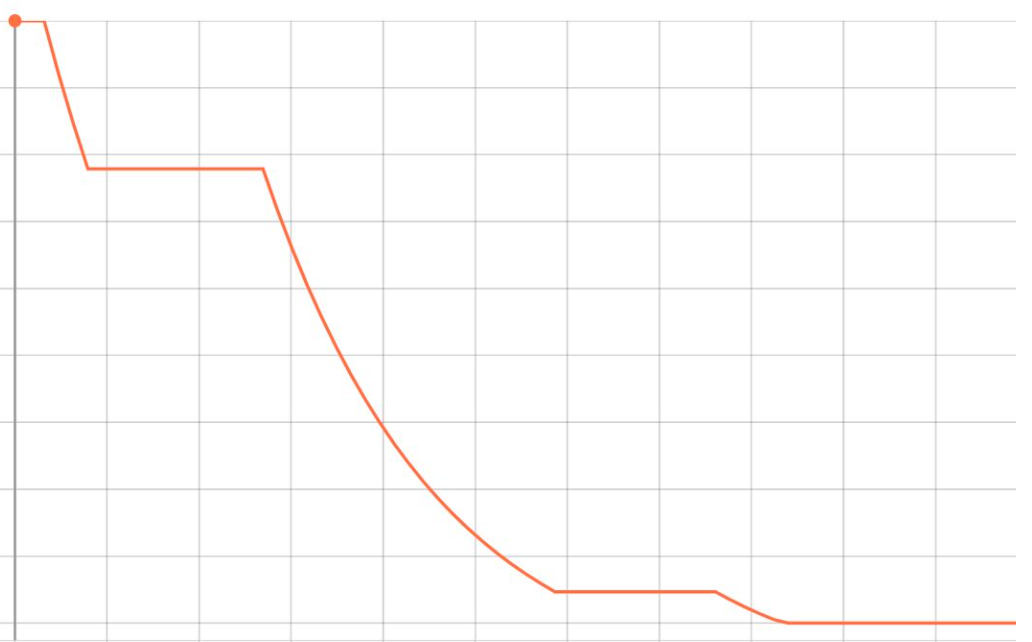 在对应区间置中不同的学习率的常数值,一般初始学习率会大一些,后面越来越小,要根据样本量的大小设置区间的间隔大小,样本量越大,区间间隔要小一点。在真正的网络训练中,需要操作人员根据具体任务对学习率具体设置。下图即为分段常数衰减的学习率变化图,横坐标代表训练次数,纵坐标代表学习率。
