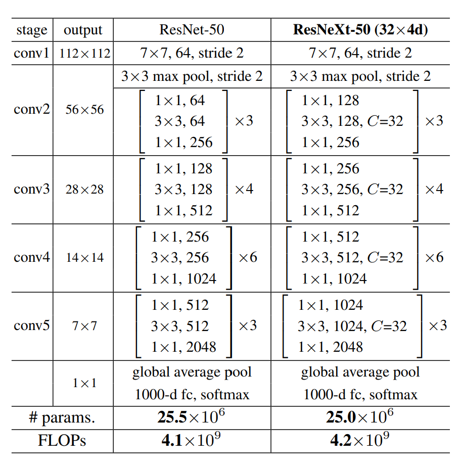 ResNet50和ResNeXt-50的网络结构图如下: