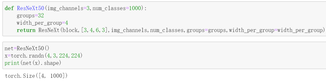 鉴于此,我们可以很轻松的通过修改ResNet-50的代码来实现ResNeXt-50。