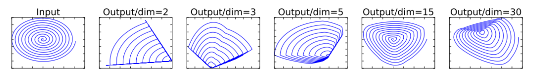 具体地,作者将一个二维空间的流形( manifolds)通过一个后接ReLU激活的变换矩阵,嵌入到另一个维度的空间中,然后再投影回原来的二维空间。