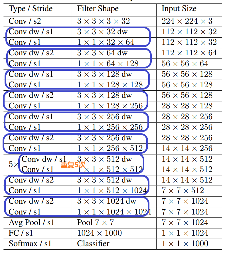 而在上面的网络结构图中,每一个蓝色框起来的两部分组合起来就是深度可分离卷积,它包括了逐通道卷积(Conv dw