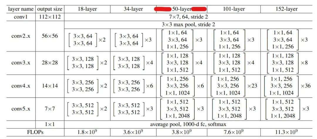 上述列出了5个不同版本的ResNet,主要区别在于层数的不同。