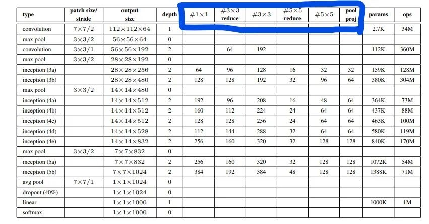red_5x5:对应`#5x5 reduce`,5x5卷积之前的`1x1`卷积输出通道数(第三分支)