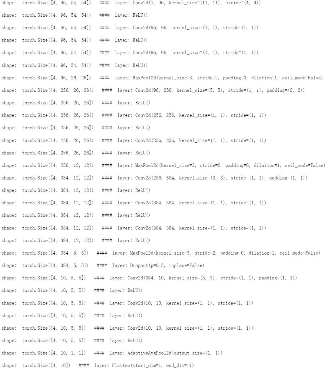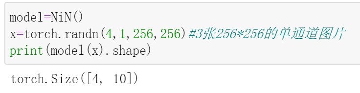 # 标签类别数是10,由于有全局平均池化层,无论输入图像尺寸如何变化,都会最终得到[bsize,类别数,1,1]的shape