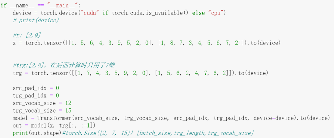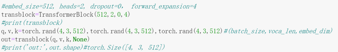 的原理,网上已经有很多优质的文章了,这里我们关心其代码实现。对于其每一个子模块(以类的形式定义),我们都会实例化一个对象,用具体的数值代入其中,把中间过程中产生的变量维度及相关信息打印出来,这些都体现在代码注释中,请留意。