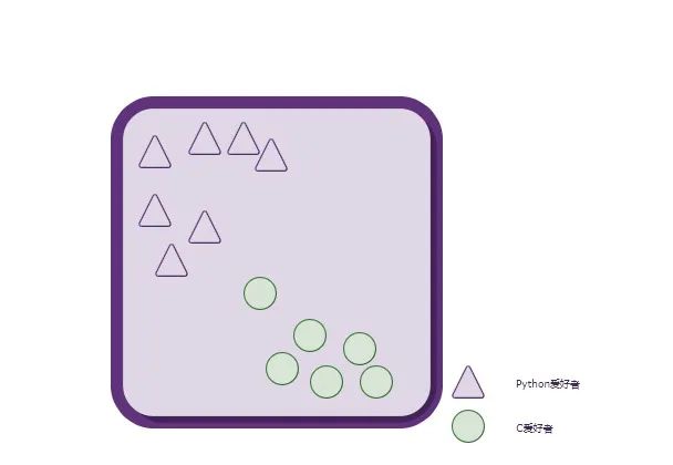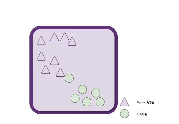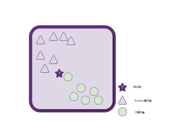 上图中,每一个形状(三角形,圆形)都代表了一个人。总共有两种形状,说明这些人总共可以分为两类:Python爱好者、C爱好者。