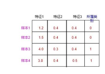 当n取4,m取3时,就是一个含有4个样本,每个样本有3个特征的数据集了,如下图