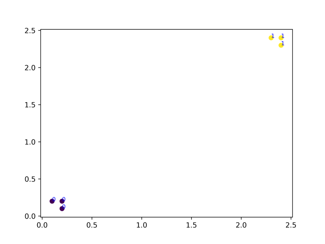 现在,自定义一个测试集,用刚刚实现的k-近邻算法对测试集样本进行分类(这里的k不妨取3):