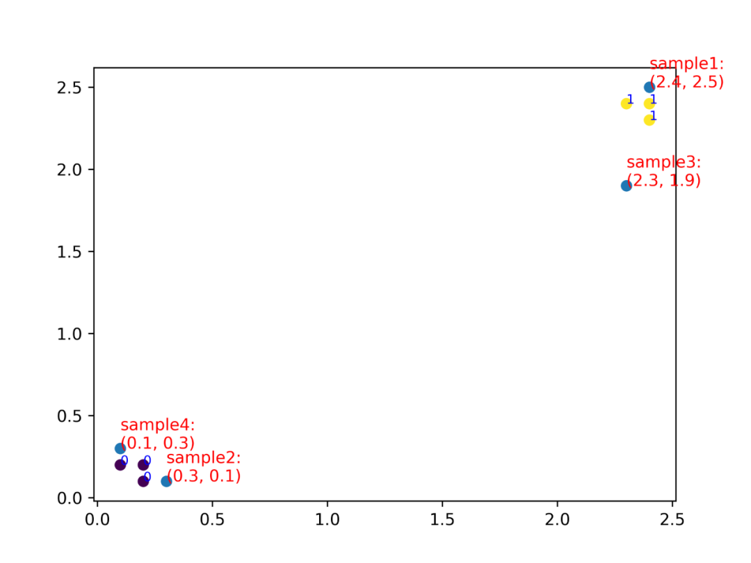 与样本1距离最近的3个样本中,大多数样本都是属于类别1的(本例是特例,全部3个样本都属于类别1),因此样本1应该归类到类别1;