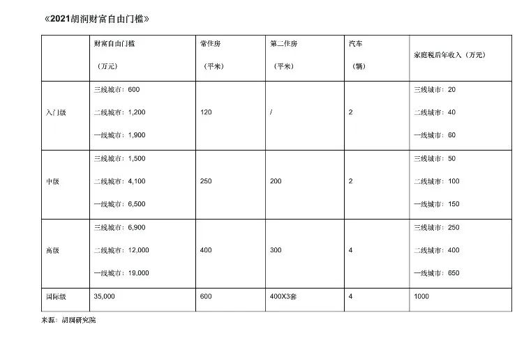 一线城市:入门级财富自由门槛为1900万元,中级6500万元,高级1.9亿元。 二线城市:入门级财富自由门槛为1200万元,中级4200万元,高级1.2亿元。 三线城市:入门级财富自由门槛为600万元,中级2100万元,高级6000万元。