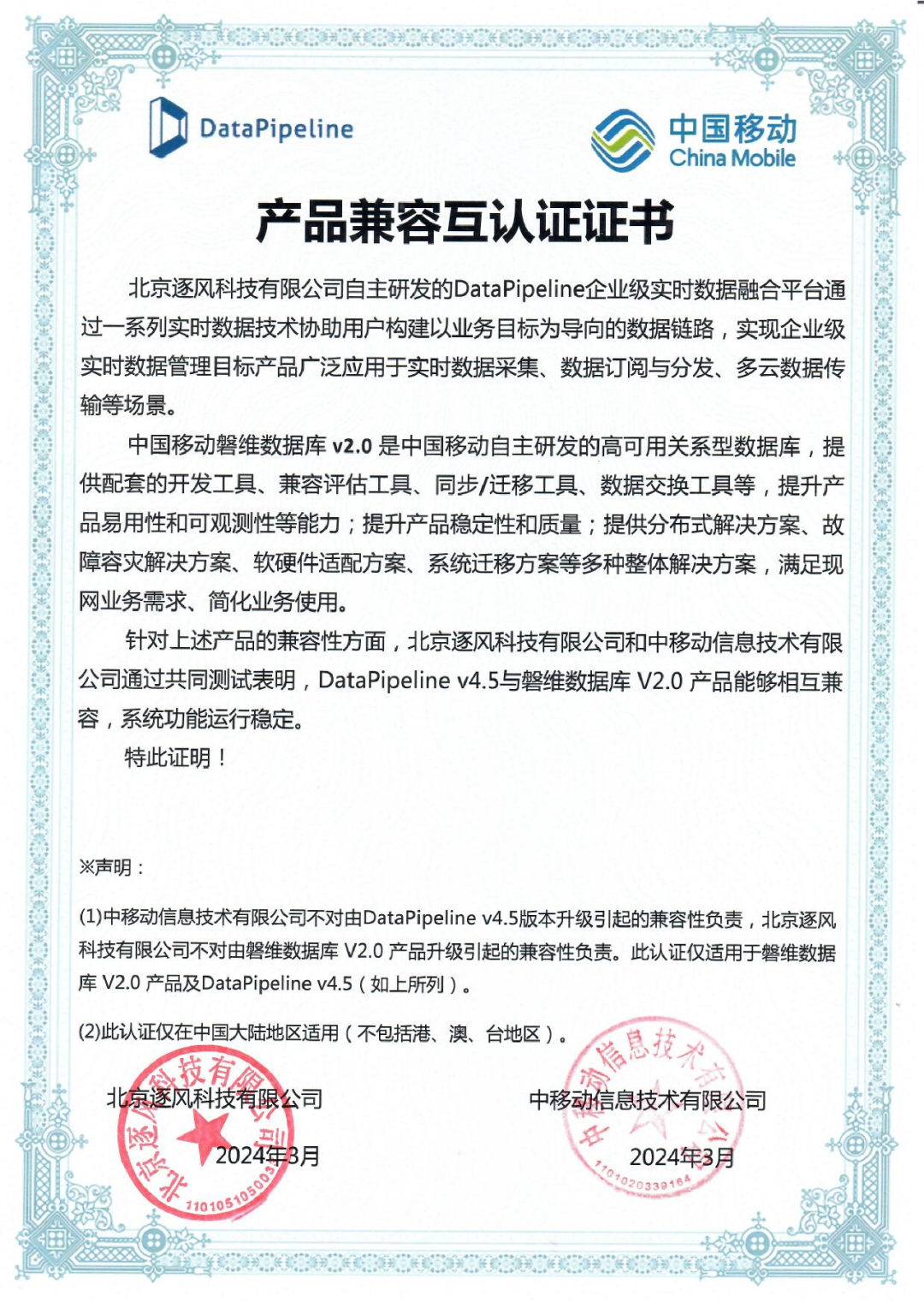 近日,DataPipeline与中国移动磬维数据库完成兼容性互认证,经过双方团队的严格测试,DataPipeline企业级实时数据融合平台与中国移动磬维数据库兼容性良好,性能优异,运行稳定高效。中移磐维数据库是中国移动基于openGauss内核打造的面向ICT基础设施的自研数据库产品。作为中国移动云原生解决方案的重要产品之一,磐维数据库融合了中国移动IT领域业务特点,具有安全性高、易用性强、性能卓越、管理智能等优势特性,为保障中国移动业务系统的数据安全和实现降本增效提供了有力的技术支撑。DataPipeline作为自主创新的数据中间件厂商,其企业级实时数据融合平台通过自主研发的实时数据技术,帮助企业构建以业务目标为导向的数据链路,可实现同、异构数据源之间的数据迁移或实时同步,满足从传统数据处理到实时数据应用的全场景需求。目前,DataPipeline已服务了中国银行、中国民生银行、中国石油、中国电信、中国人寿(海外)等在各自行业信息化水平领先的用户。在数字化转型日益加速的今天,数据已成为企业的核心资产。不论在运营、决策制定还是规划未来发展,企业越来越多地依赖于广泛而多样化的数据来进行深入的分析。在这一过程中,数据库和中间件作为关键的数字基础设施,不仅支撑着企业的业务发展,更是推动创新、开拓新业务领域的重要力量。