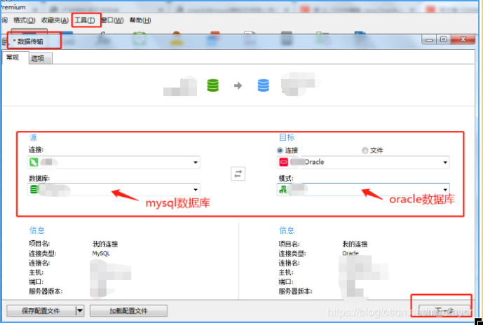 选择导出的mysql数据库和导入的oracle数据库