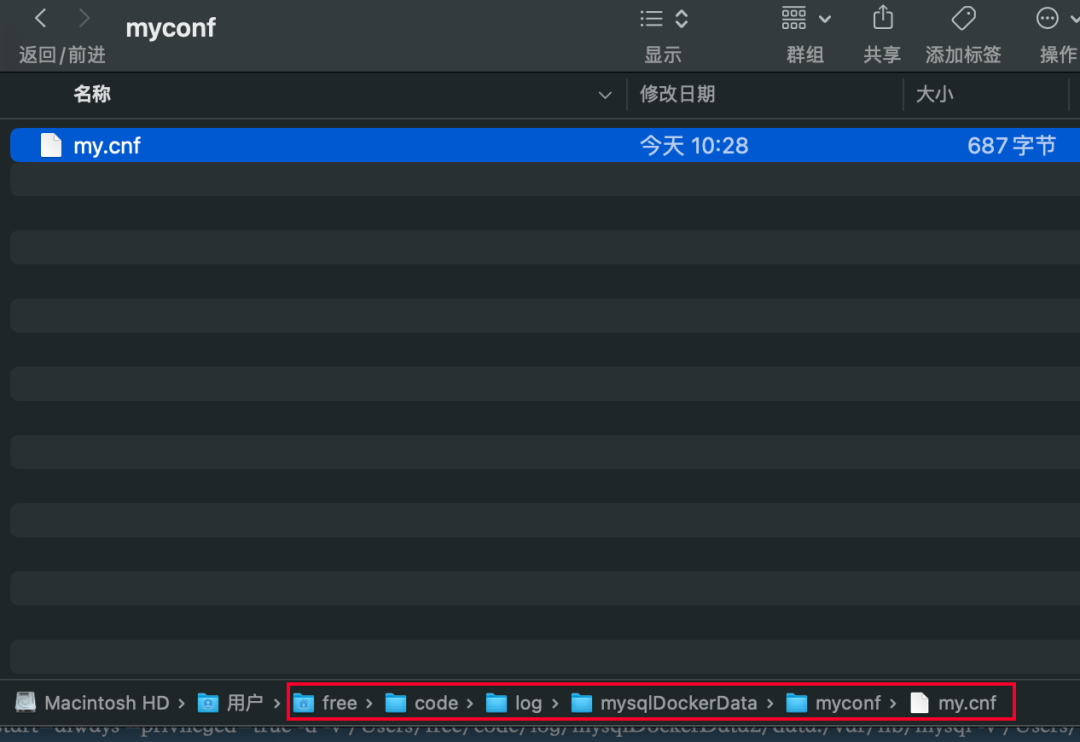 5.1 同理在/Users/free/code/log/mysqlDockerData2/myconf目录下新建my.cnf并添加配置