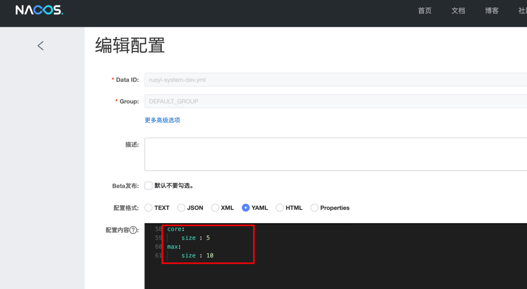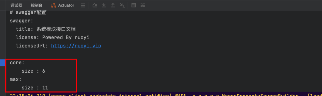 @Value("${max.size}"),@Value("${core.size}"):这两个注解用来读取我们上一步在nacos配置的具体信息;同时,nacos配置变更时,能够实时读取到变更后的内容
