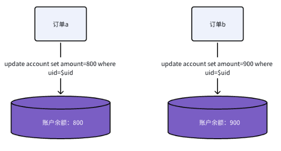 此时就出现问题了,如果订单 a 先执行更新,订单 b后执行,那么账户余额最终为900,反之为 800,都不正确,正确余额应该是700,那怎么处理呢?