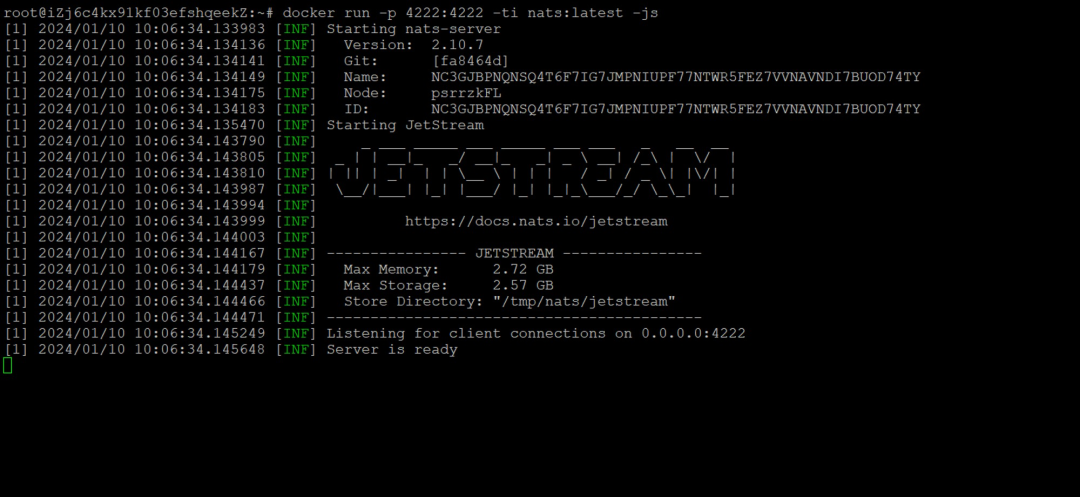 该 Docker 命令可启动 NATS JetStream。现在,您可以通过各种语言和客户端发布和订阅信息。