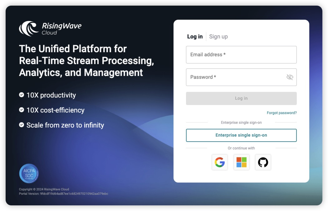 使用免费计划在 RisingWave Cloud 中创建 RisingWave 集群。有关说明,请参阅 RisingWave Cloud 文档。