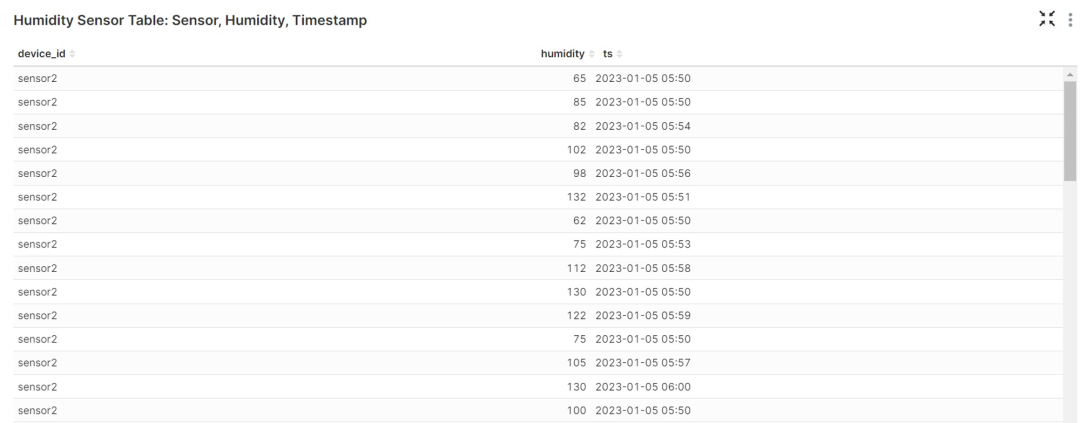 数据集生成,显示湿度传感器 ID、湿度读数以及每个读数相应的时间戳等详细信息。它全面展示了在 iot_mv