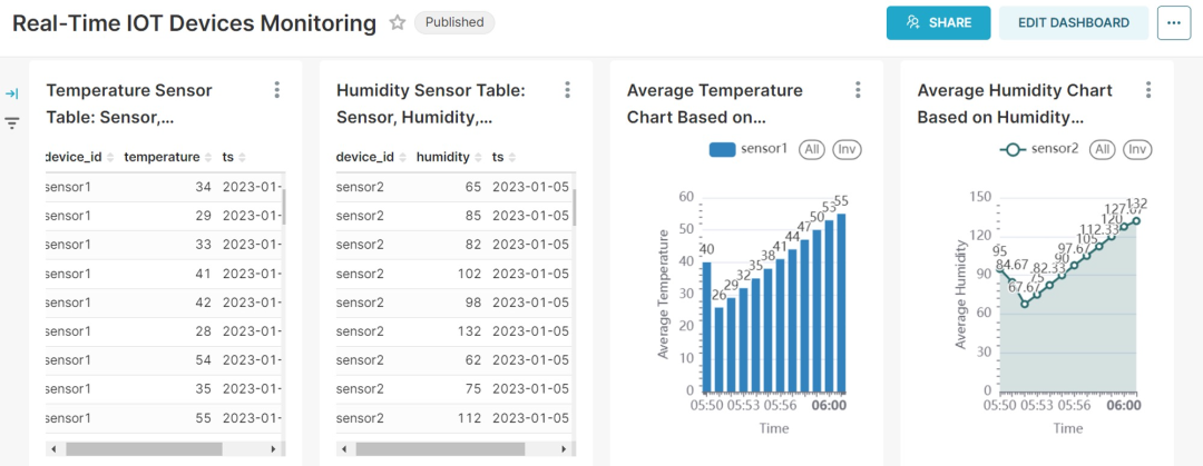 此综合看板呈现了一系列图表,有助于全面实时监控物联网设备。通过对每个相应时间戳的温度和湿度传感器读数进行深入分析,获取有价值的见解,使用户能够做出明智的决策,并实现对工业物联网设备的有效监控。