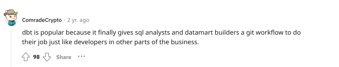 Reddit 经典提问: https://www.reddit.com/r/dataengineering/comments/r8pa3i/why_is_data_build_tool_dbt_is_so_popular_what_are/