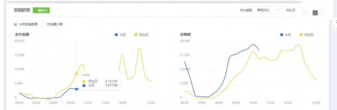 前面给出的例子实际上只需要使用天粒度的物化视图就可以满足需求。而我们之前还创建了一个分钟和小时级别的支付金额物化视图,在实时趋势图中它就可以派上用场了。显然,我们可以绘制分钟级别或小时级别的数据曲线图,然后比较任意两天的数据。在实时场景中,还可以实时计算当天相对于昨天的增长率,这也适用于电商大促活动日对实时数据比较感兴趣的情况。