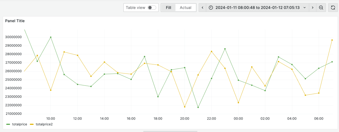 得益于 RisingWave 兼容 PostgreSQL 协议,我们可以直接利用 Grafana 对RisingWave 的数据进行可视化展示。下面我们使用 Grafana 选择 RisingWave 作为 PostgreSQL 协议兼容数据源,查询小时粒度的物化视图 orders_total_price_per_hour 中的时序数据。例子中我们挑选 2024-01-11 作为对比日,2024-01-12 作为当前日。