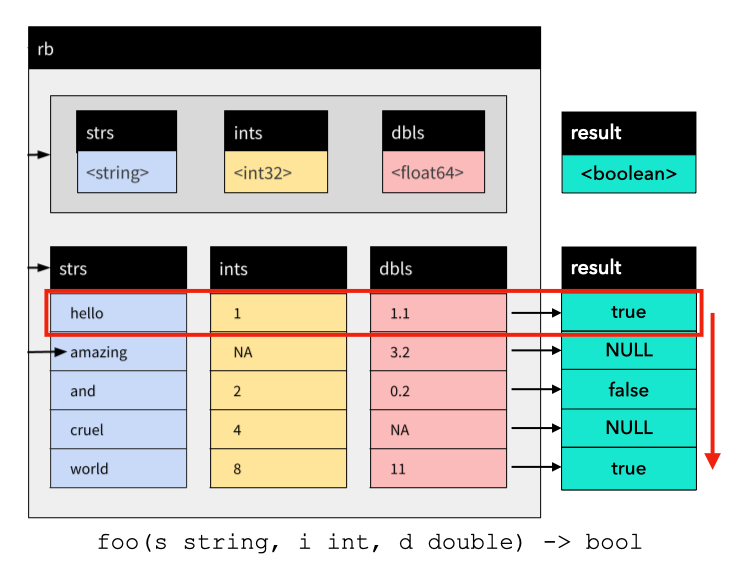 在函数求值时,我们首先把每个输入参数对应的数据列合并成一个 RecordBatch,然后依次读取每一行的数据,作为参数调用函数,最后将函数返回值压缩成一个数组,作为最终返回结果。这种一次处理一批数据的方式就是向量化计算。