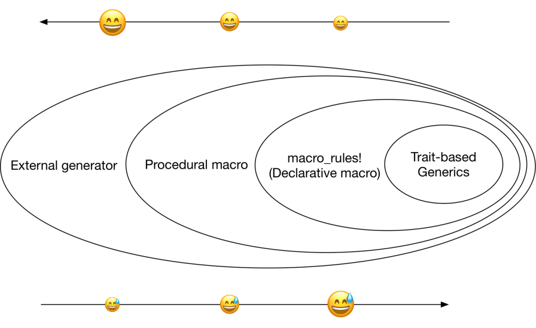 从方法论的角度来讲,一旦开发者在某个需要使用泛型的地方使用了宏展开,调用它的代码就不可能再通过 trait-based generics 使用这段代码。从这个角度来说,越是“大道至简”的生成代码,越难维护。但反过来说,如果要完全实现 trait-based generics,往往要和编译器斗智斗勇,就算是通过编译也需要花掉大量的时间。