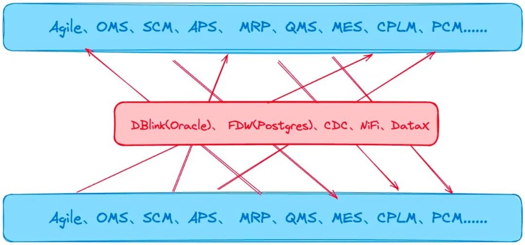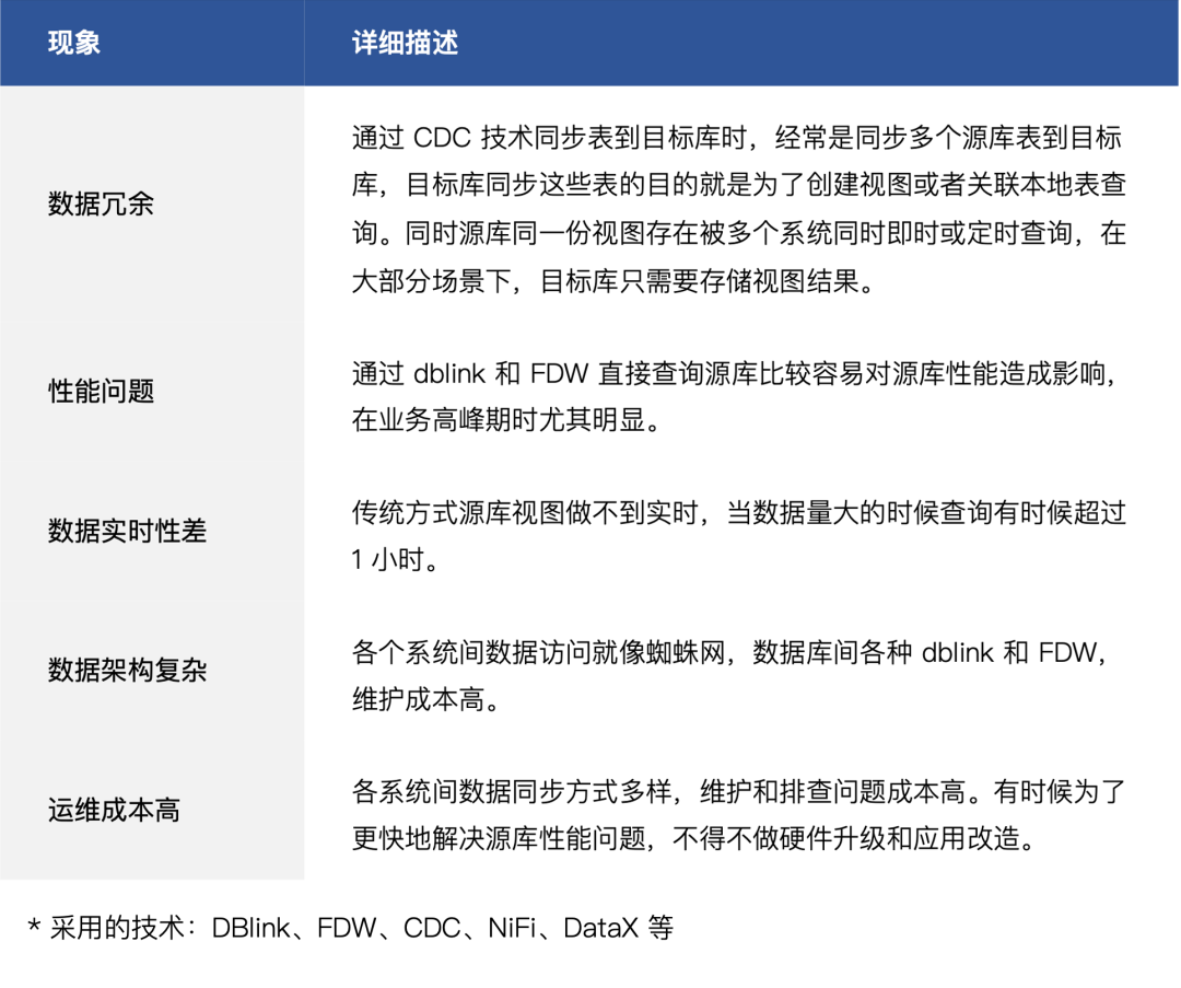 在早期系统数量少,数据量不大时通过 CDC 技术实时同步表和定时查询视图同步到目标库两种方案可满足业务要求。但是随着业务的发展,系统越来越多,系统间数据交互越来越复杂,同时数据量越来越大,导致数据应用存在如下问题。