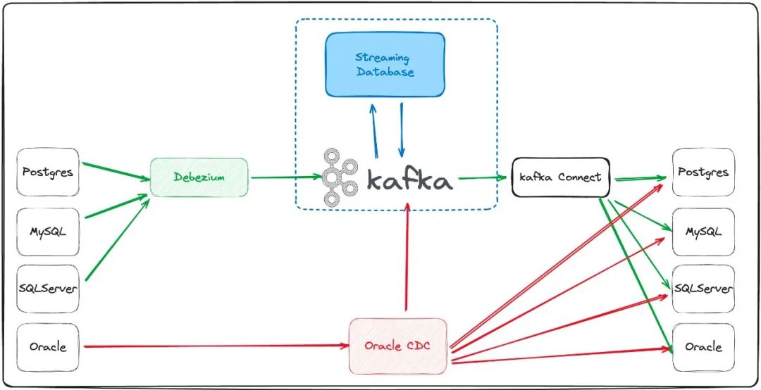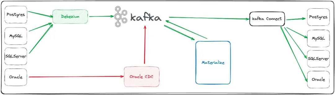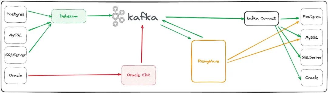 各种数据库数据通过 CDC 技术实时同步至 Kafka。 流计算系统消费 Kafka 里的流消息做流计算。 流计算结果实时写入目标库或 Kafka。CVTE 统一将数据写入 Kafka,然后再通过 Kafka Connect sink 到目标库。统一写入 Kafka 再写入数据库是为了将写入过程跟流计算服务解耦,也便于数据追溯和写入结果排查,同时也可以统一在 Kafka Connect 平台管理 sink connect。 目标系统根据需要在流数据集成平台订阅表数据或实时视图数据,而不是像以前点对点处理数据需求。避免一个表多次抽取和一个系统的视图被多次查询而影响源库性能。 异构库间的表实时同步。例如从 Postgres 同步到 Oracle,或者从 Oracle 同步到 Postgres。