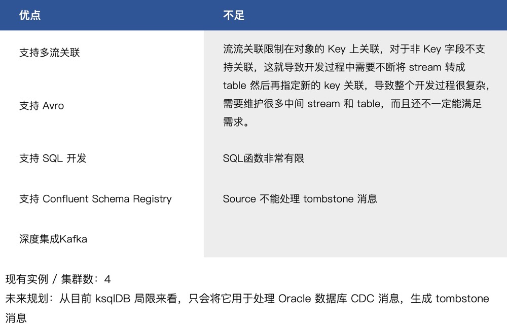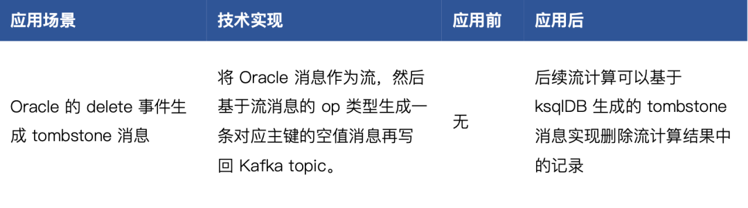 由于之前提到的 PipelineDB 不足,同时想在更多业务场景应用流计算,所以开始探索 ksqlDB 方案,由于一个关键缺陷导致无法应用于业务中。关键缺陷就是技术应用总结表中的第一行不足。虽然无法应用于具体业务场景,但正是由于这次探索为后来的 Oracle 的 delete 事件生成 tombstone 消息提供了解决方案。