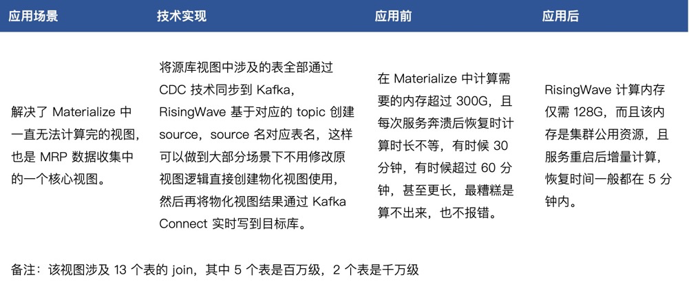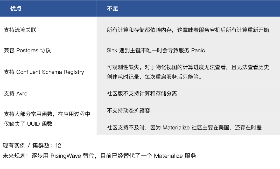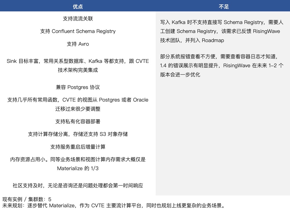 由于 Materialize 的不足导致流计算技术大规模应用还是存在顾虑,CVTE 也一直没有停下探索更优的解决方案,在 2021 年 RisingWave 成立之初就应开始关注,由于当时产品还不是很成熟,所以一直等到 2023 年初开始合作。从目前测试和生产应用结果看,RisingWave 无论是在功能特性上还是服务可用性上都比 Materialize 社区版好,所以 CVTE 也在逐步迁移之前在 Materialize 上的应用至 RisingWave,同时也在测试更大的业务应用方案,例如物料实时计算平台,主数据实时计算等。CVTE 跟 RisingWave 合作的整个过程很顺利,大家也都是朝着完善产品的方向努力,致力于将 RisingWave 应用于更多业务场景。以下对 RisingWave 的总结是基于 1.4 版本。