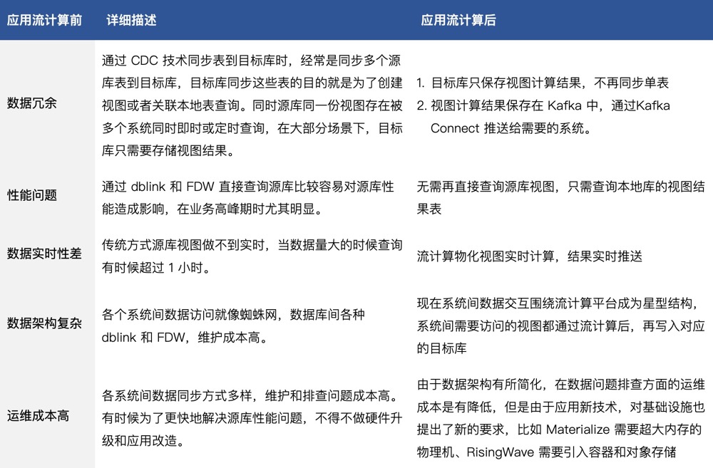 支持 SQL 开发,且兼容标准的 SQL 标准。 视图计算无需查询源库。 支持增量的视图计算。区别于传统数据库里的物化视图,这种物化视图随着基表数据变化实时计算。 实时物化视图的结果支持实时写到目标库。 支持 join 计算。