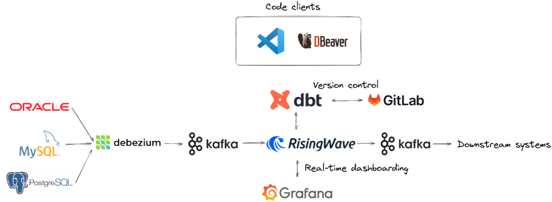 为了能尽快使用上 RisingWave,CVTE 的一名 SRE 使用 Kubernetes 完成了 RisingWave 的部署。此外,一名专业工程师在生产条件下验证了 RisingWave 的性能。如今,RisingWave 已成为 CVTE 基础设施的不可或缺的部分,管理着众多的物化视图并增强了实时仪表板功能。其架构有效地管理复杂的流式数据库 Query,其中包括 10 多路 Streaming Join、Temporal Filter、聚合等等。该系统通过 debezium CDC 处理数据,并通过 JDBC 和 Kafka sink 将其数据 Sink 到下游数据库的能力非常出色。CVTE 的技术团队每天都通过 DBeaver UI 与 RisingWave 进行交互。