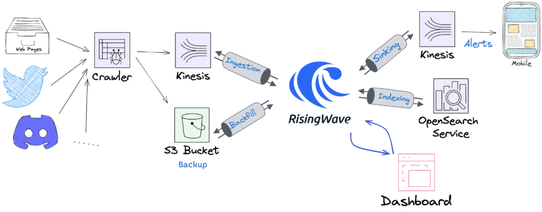 陡峭的学习曲线: 尽管团队具备深厚的技术背景,但对于像 Kaito 这样一个高速发展的公司来说,他们不太愿意在繁琐的系统学习过程中投入大量时间和精力,而是需要一个能够快速上手并满足当前需求的解决方案。 复杂的数据栈: Flink 仅提供计算功能,如果 Kaito 希望使用 Flink 来构建仪表板,他们将需要额外购买数据库来支持查询服务,这将导致显著的成本增加。 无法瞬时弹性扩缩容:Flink 作为一个 12 年前诞生的系统,它采取用了存储计算耦合的架构。在扩缩容时,数据需要重新排布、并导入相应的本地RocksDB。在 Kaito 巨大的数据量下,这个耗时的过程额外漫长。无法给予Kaito 保证客户可以 24 小时获取实时信息流的能力。
