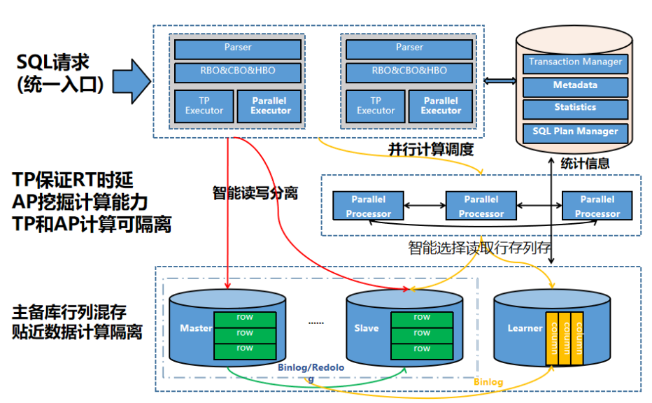 GoldenDB自主研发分布式SQL引擎,重点突破分布式并行执行框架、复杂查询改写、行列混合存储、向量化等关键技术,实现一套引擎同时支撑业务系统运行和分析决策场景,避免在传统架构中在线与离线数据库之间大量的数据交互,行列存储、冷热数据分级存储、向量计算、LLVM, CPU指令集优化、Online Schema Change、B+Tree索引无锁优化等技术,大幅提升面向复杂查询场景的处理能力。