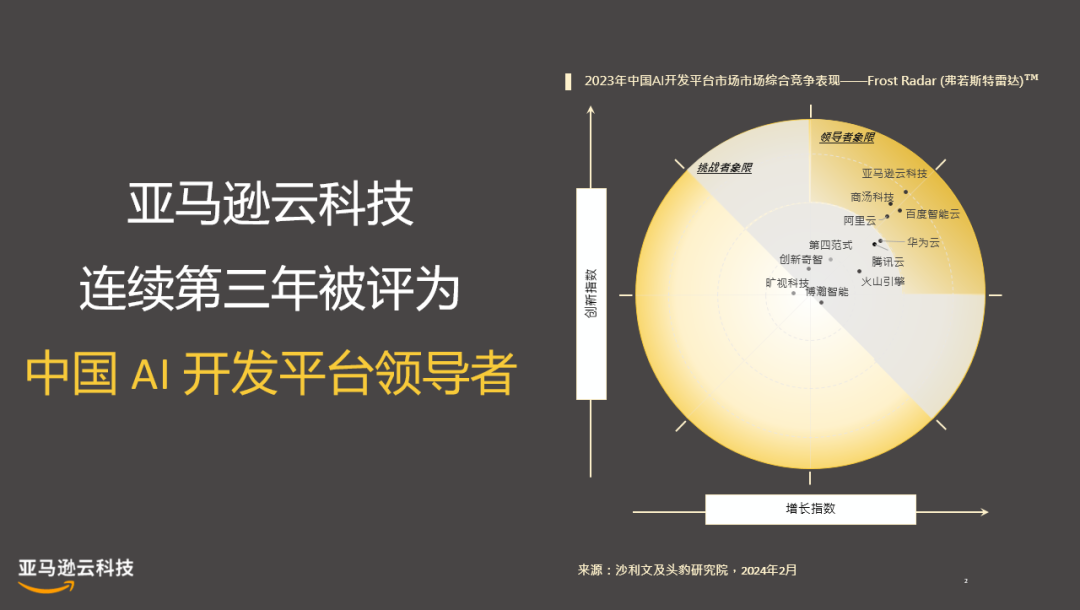 权威机构弗若斯特沙利文(Frost&Sullivan,简称“沙利文”)联合头豹研究院发布了《2023年中国 AI 开发平台市场报告》。报告对 AI 开发平台的数据处理能力,模型构建、训练、评估、部署和推理能力,安全与权限管理能力,服务支持水平,以及应用场景解决方案丰富度等指标进行了增长和创新两个维度的评估,并结合了用户调研结果。亚马逊云科技连续第三年被评为中国 AI 开发平台 “领导者”,并连续在增长指数和创新指数两个维度蝉联第一。