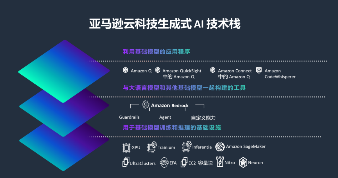 在生成式 AI 领域,亚马逊云科技支持构建生成式 AI 应用的解决方案包括三层:用于基础模型训练和推理的基础设施、使用基础模型进行构建的工具、利用基础模型构建的开箱即用的应用程序。