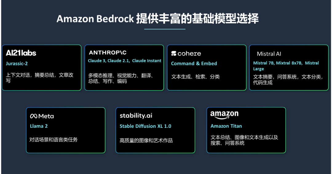 例如,由 Anthropic 推出的 Claude 3 在发布的同时即在 Amazon Bedrock 登陆,这一模型家族包含 Claude 3 Haiku、Claude 3 Sonnet 和 Claude 3 Opus(即将上线)三个模型,支持中文及多种语言,并以其卓越的自然语言处理和计算机视觉能力成为了业界翘楚。Mistral AI 的领先模型 Mistral Large 也已登陆 Amazon Bedrock,Mistral Large 拥有出色的语言理解和生成能力,非常适合需要推理能力或高度专门化的复杂任务,如合成文本生成、代码生成、检索增强生成(RAG)或智能代理。
