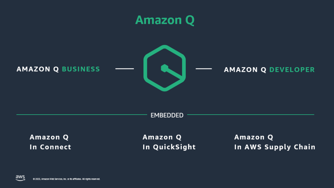 Amazon Q 是全新的基于生成式 AI 的助理,专门为工作场景设计,可以根据客户的业务进行定制。用户可以快速获得紧迫问题的答案,生成内容并采取行动——所有这些都基于企业的信息存储库、代码和企业系统。Amazon Q 具备五个专业领域,Amazon Q Business、Amazon Q Developer、Amazon Q in QuickSight、Amazon Q in Connect 和 Amazon Q in Supply Chain。