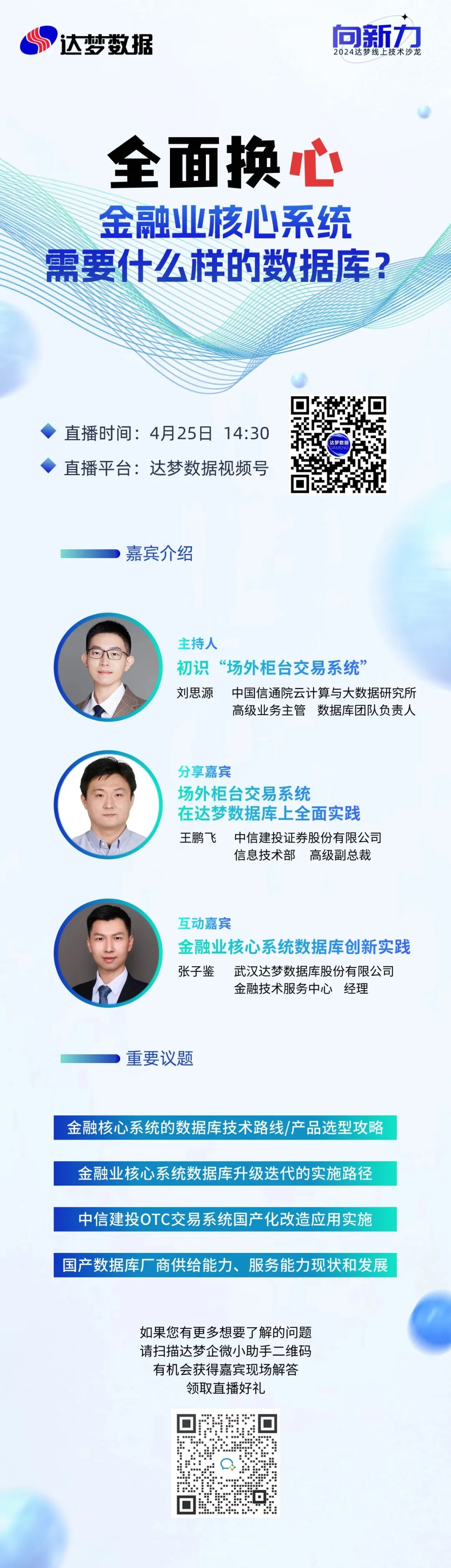 我们将特邀中国信通院云计算与大数据研究所高级业务主管、数据库团队负责人刘思源作为直播主持人,带领大家认识“场外柜台交易系统”,并将邀请中信建投证券股份有限公司信息技术部高级副总裁王鹏飞作为嘉宾为大家分享《中信建投场外柜台交易系统在达梦数据库上全面实践》,同时还有武汉达梦数据库股份有限公司金融技术服务中心经理张子鉴为大家带来达梦数据在产品性能和技术服务等方面的经验分享;围绕“金融业核心系统数据库创新实践”等相关话题,带大家共同探索金融业核心系统中数据库技术路线选择、产品选型、实施策略与路径、运维管理等。