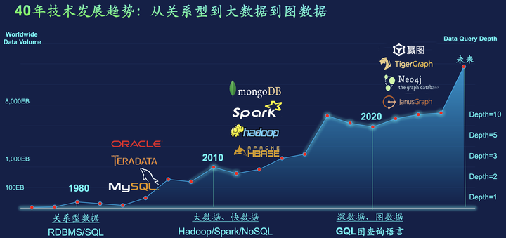 图2:过去40年来,数据处理技术的发展趋势是从关系型到大数据再到图数据