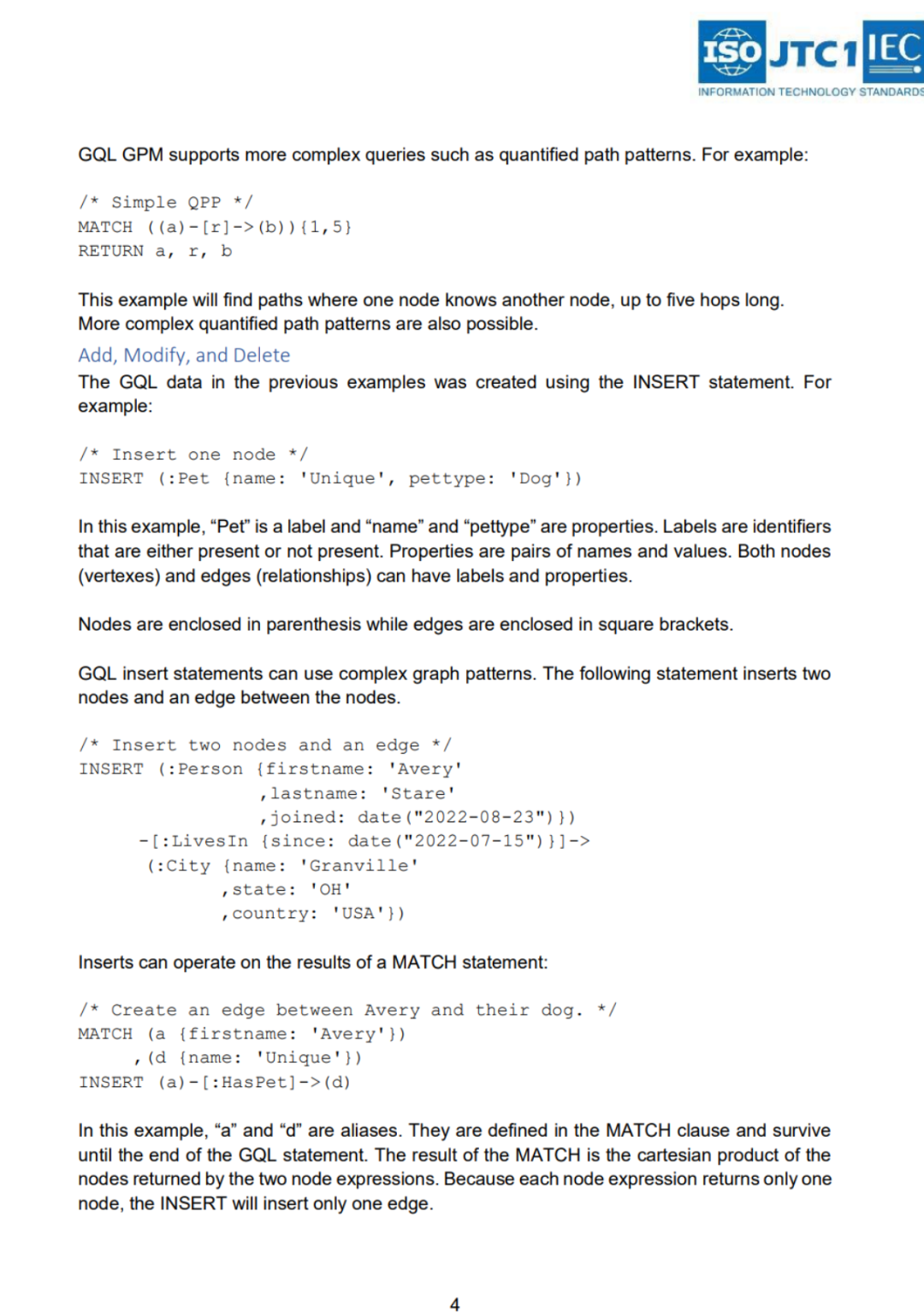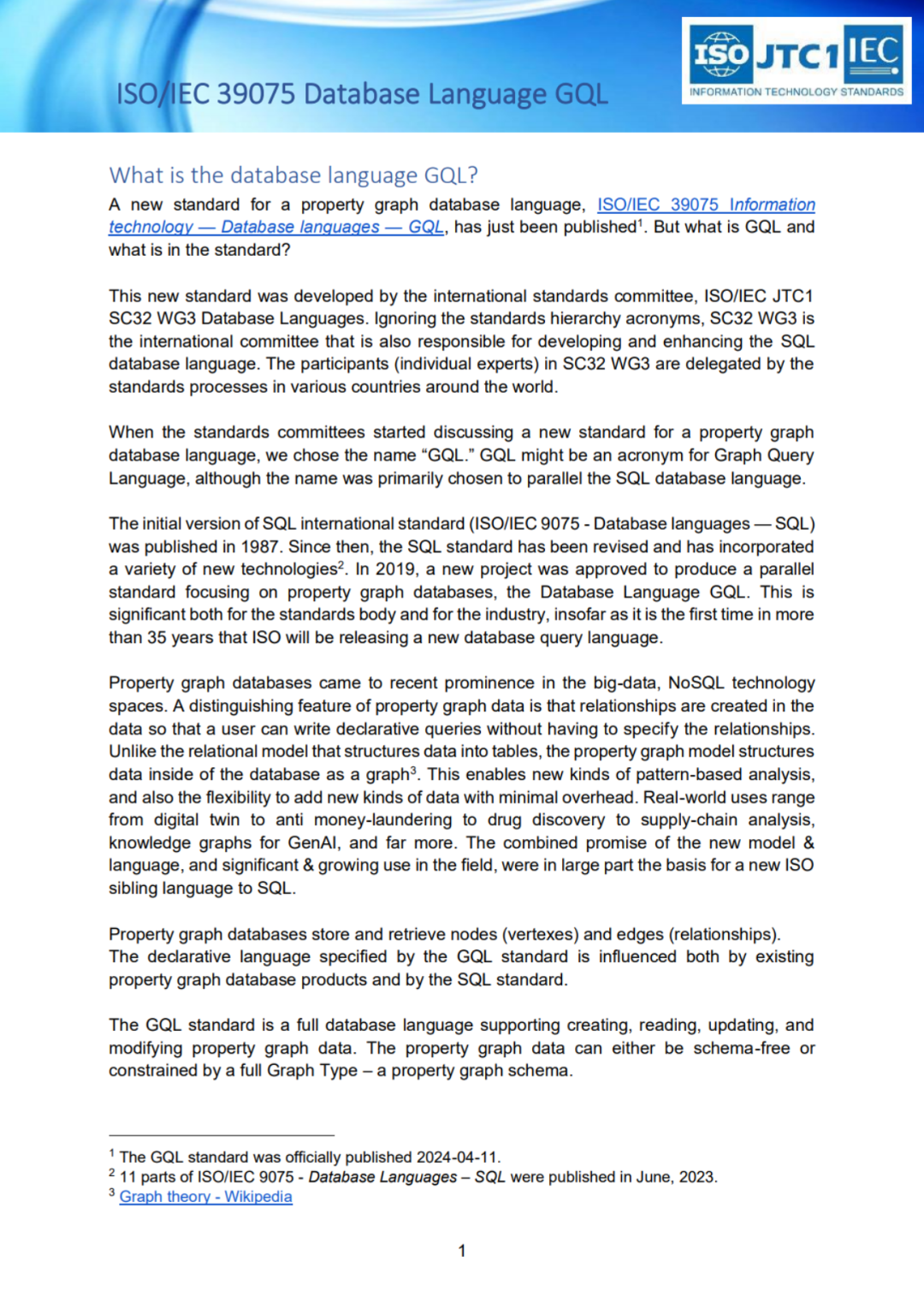 4月12日,ISO(国际标准化组织)与IEC(国际电工委员会)共同发布了 GQL(Graph Query Language)1.0,标准编号为 ISO/IEC 39075:2024。自1987年发布 SQL 版本问世以来,GQL成为了又一官方国际数据库查询语言标准,这无疑为图技术的互操作性和广泛应用奠定了基础。