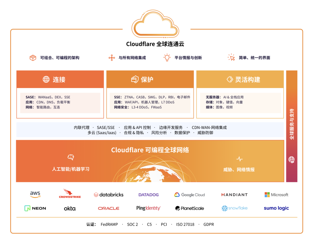 其实 Cloudflare 不是传统公有云,而是一种 SaaS。我们现在管自己叫做 “Connectivity Cloud”(翻译为:全球联通云),旨在为所有事物之间建立连接,与所有网络相集成;内置情报防范安全风险,并提供统一、简化的界面以恢复可见性与控制。从传统的视角来看,我们做的像是安全、CDN与边缘计算的一个整合。AWS 的 CloudFront 算是我们的竞品。