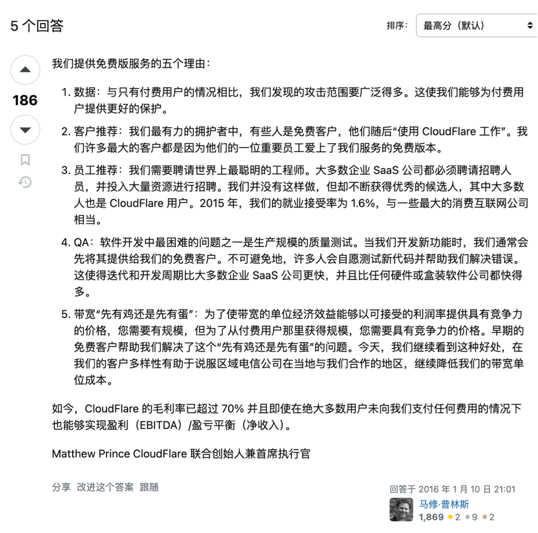 Cloudflare 的核心商业模式是安全。相比于只服务付费客户,更多的免费用户可以带来更深入的数据洞察 —— 也就能够发现更为广泛的攻击与威胁情报,为付费用户提供更好的安全服务。