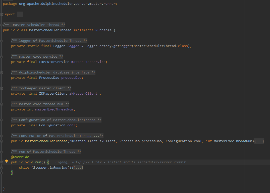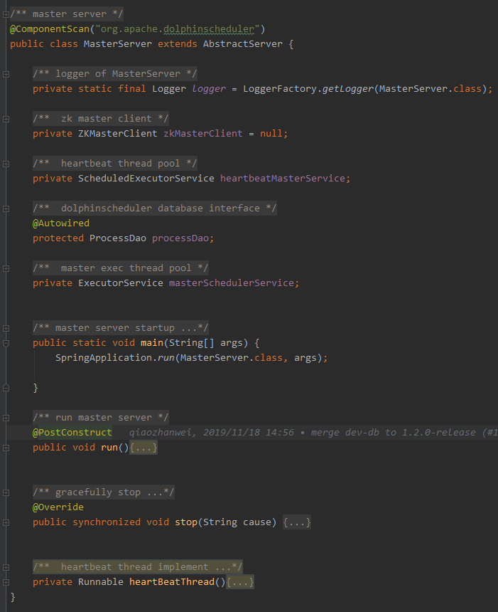 // start QuartzExecutors// what system should do if exceptiontry {ProcessScheduleJob.init(processDao);QuartzExecutors.getInstance().start();} catch (Exception e) {try {QuartzExecutors.getInstance().shutdown();} catch (SchedulerException e1) {logger.error("QuartzExecutors shutdown failed : " + e1.getMessage(), e1);}logger.error("start Quartz failed : " + e.getMessage(), e);}/*** register hooks, which are called before the process exits*/Runtime.getRuntime().addShutdownHook(new Thread(new Runnable() {@Overridepublic void run() {if (zkMasterClient.getActiveMasterNum() <= 1) {for (int i = 0; i < Constants.DOLPHINSCHEDULER_WARN_TIMES_FAILOVER; i++) {zkMasterClient.getAlertDao().sendServerStopedAlert(1, OSUtils.getHost(), "Master-Server");}}stop("shutdownhook");}}));
