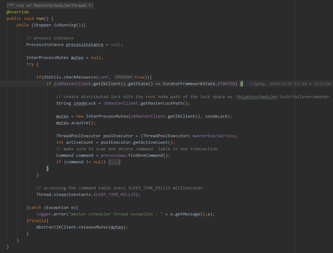 调用OSUtils.checkResource,检查当前资源(内存、CPU)。 资源超出阈值,则休眠1秒进入下一次循环。 检查zookeeper是否连接成功 获取一个InterProcessMutex锁(分布式的公平可重入互斥锁)。也就是只有一个master可以获取到这个锁 查询一个Command,如果当前线程数够用,则创建一个流程实例(ProcessInstance),交给MasterExecThread线程处理。 休眠1秒,进入下一次循环 进入下一次循环之前,释放InterProcessMutex锁