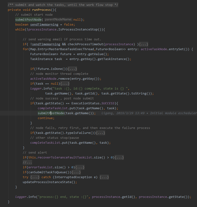 @Overridepublic void run() {// process instance is nullif (processInstance == null){logger.info("process instance is not exists");return;}// check to see if it's doneif (processInstance.getState().typeIsFinished()){logger.info("process instance is done : {}",processInstance.getId());return;}try {if (processInstance.isComplementData() && Flag.NO == processInstance.getIsSubProcess()){// sub process complement dataexecuteComplementProcess();}else{// execute flowexecuteProcess();}}catch (Exception e){logger.error("master exec thread exception: " + e.getMessage(), e);logger.error("process execute failed, process id:{}", processInstance.getId());processInstance.setState(ExecutionStatus.FAILURE);processInstance.setEndTime(new Date());processDao.updateProcessInstance(processInstance);}finally {taskExecService.shutdown();// post handlepostHandle();}}