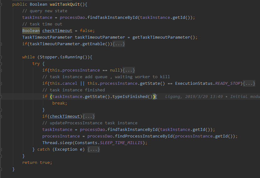 通过taskInstance.id查询taskInstance。其实就是查询taskInstance的最新状态。 通过参数判断是否启用超时检查 一个while“死循环”。 while中判断任务是否执行结束,是则退出 获取任务实例、流程实例最新状态 休眠1秒,进入下一次while循环