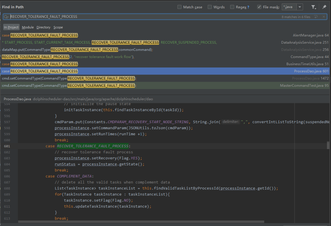 List<TaskInstance> taskInstanceList = processDao.findValidTaskListByProcessId(processInstance.getId());for(TaskInstance task : taskInstanceList){if(task.isTaskComplete()){completeTaskList.put(task.getName(), task);}if(task.getState().typeIsFailure() && !task.taskCanRetry()){errorTaskList.put(task.getName(), task);}}